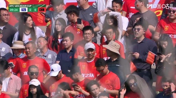 第9分钟,U23国足门将李昊突然躺在地上,镜头给到看台上球迷,充满着惊讶。